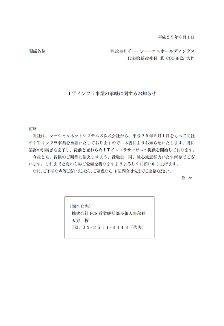 事業譲渡による取得のお知らせ(マーシャルネットシステムズ株式会社)