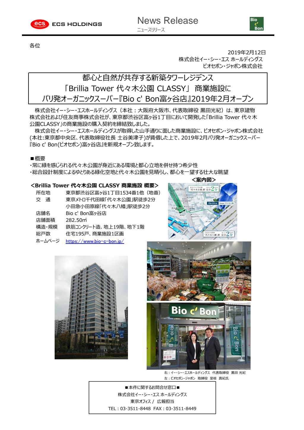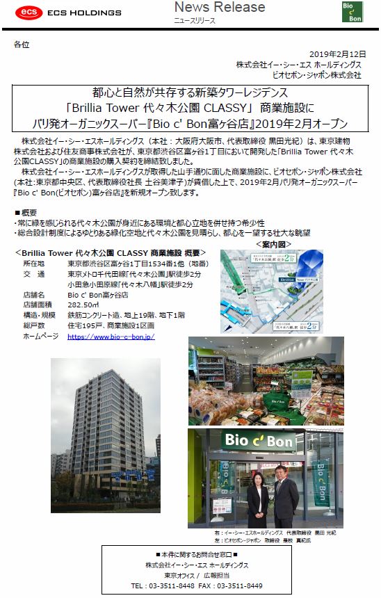 「Brillia Tower 代々木公園 CLASSY」 商業施設購入、並びにパリ発オーガニックスーパー『Bio c' Bon富ヶ谷店』2019年2月オープンのお知らせ