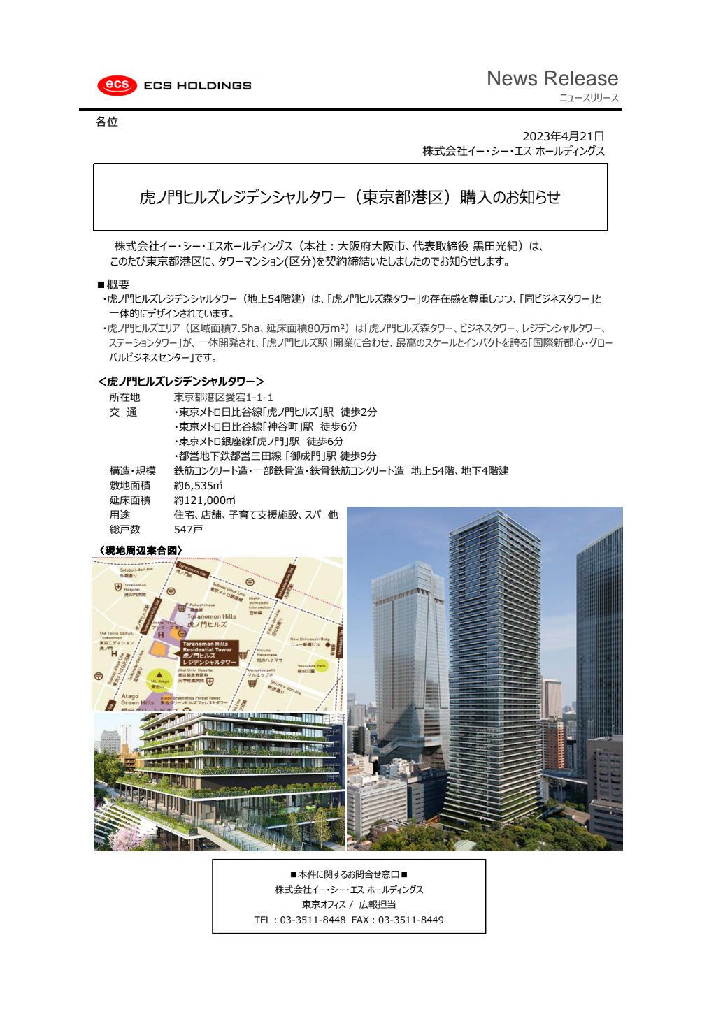 虎ノ門ヒルズレジデンシャルタワー(東京都港区)購入のお知らせ